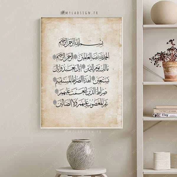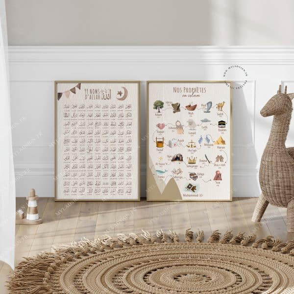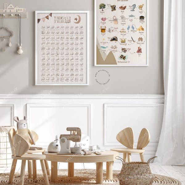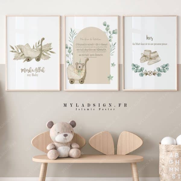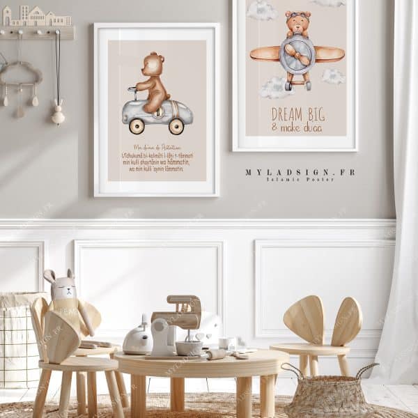 Poster islamique Ayat kursi aux couleurs douces et chaleureuse avec le fameux teddy bear respectant nos valeurs (sans visage) , éthique et tendance pour décorer avec amour la chambre de vos enfants et permettre l’apprentissage de ce verset protecteur.