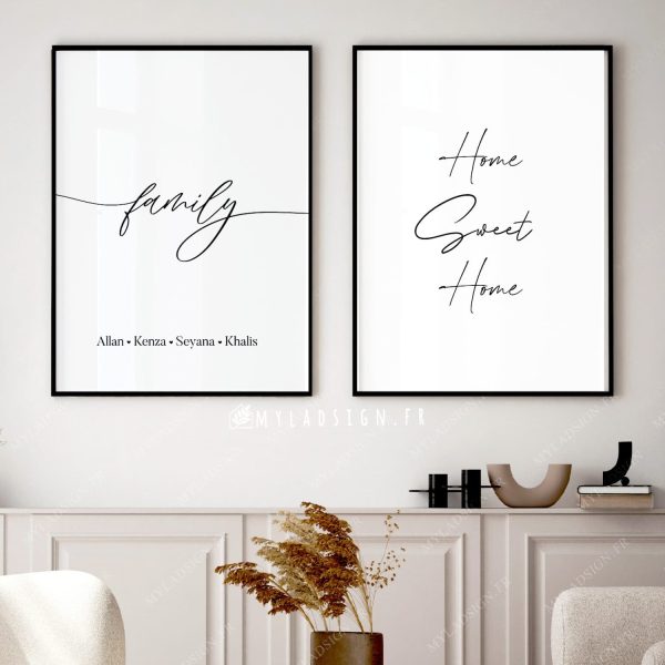 Poster sur fond beige ornée de feuille de palmier doré avec le terme family et a personnaliser avec les prénoms de la famille. Idéal pour décorer un pan de mur et apporter une touche de chaleur.
