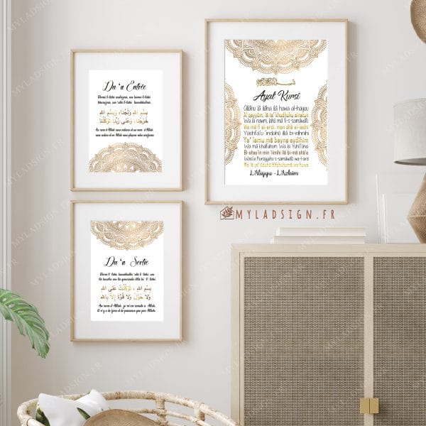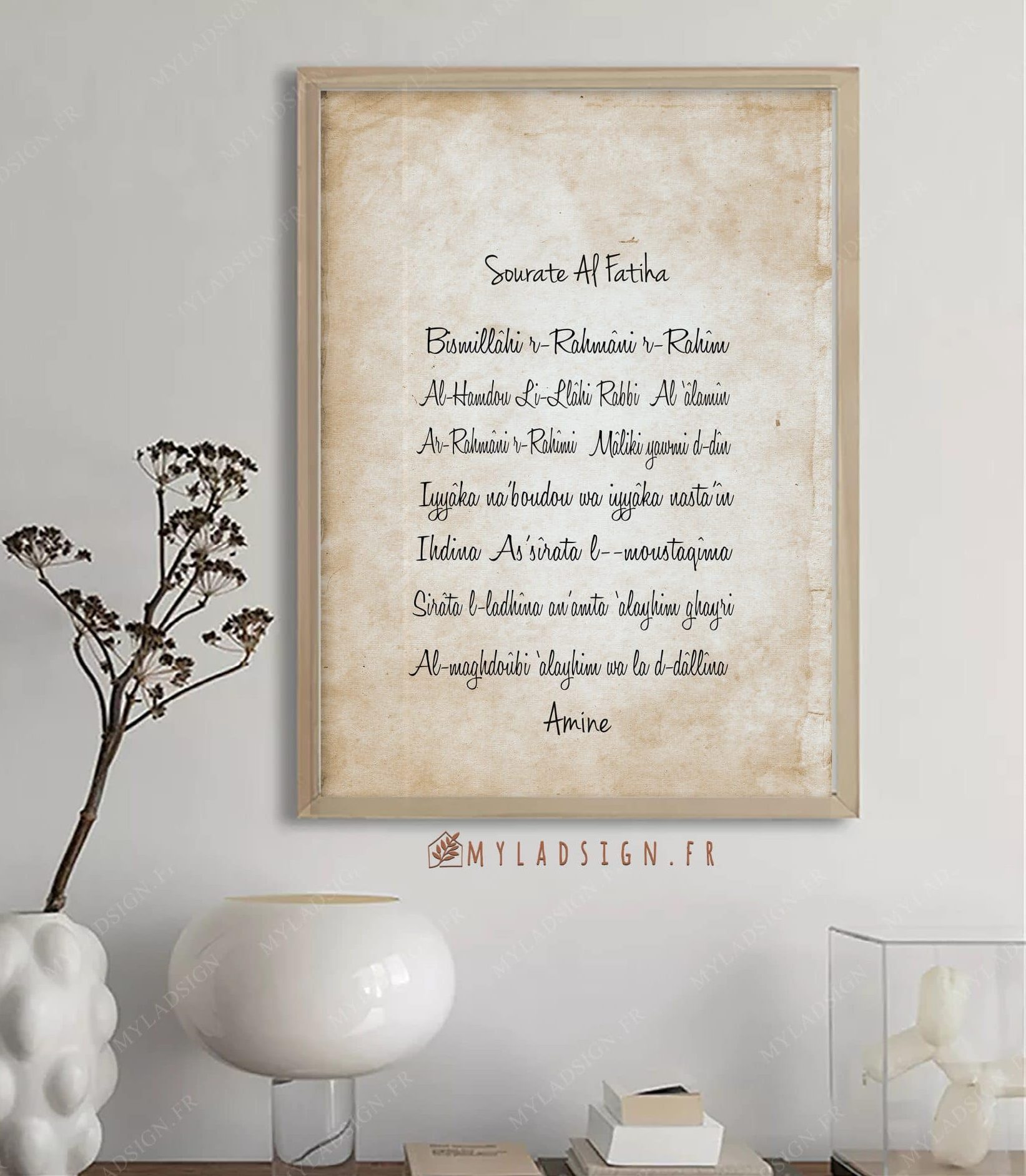 Sourate Al fatiha sur fond effet parchemin qui donne un effet vintage et chaleureux.Au choix version arabe ou phonétique , idéal pour l’apprentissage de celle ci.