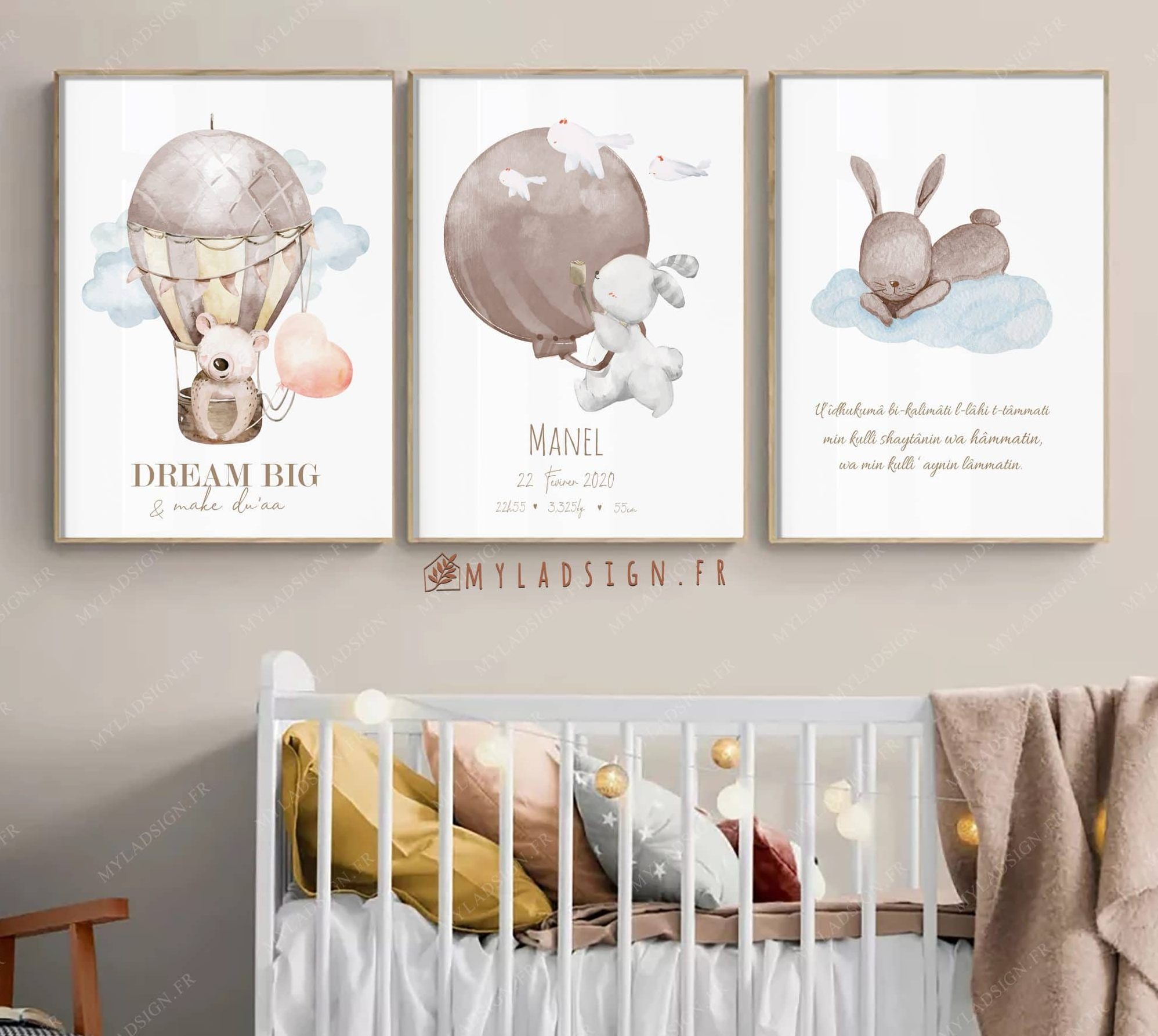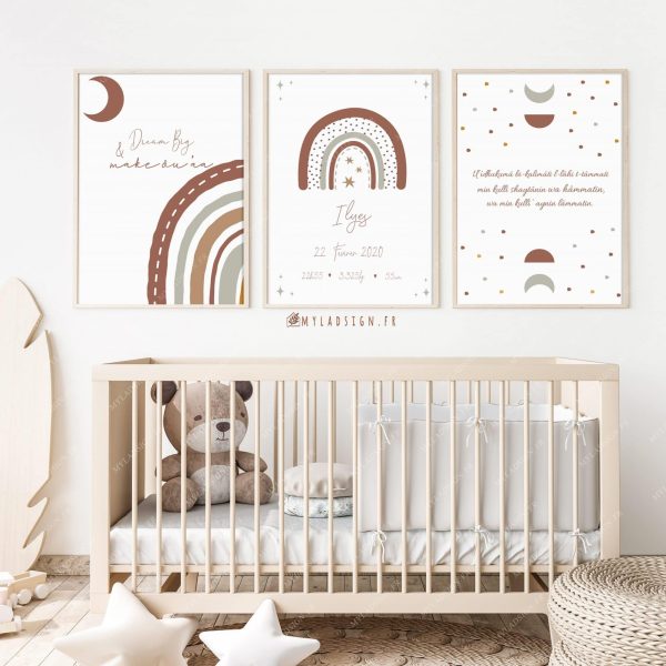 Ce magnifique trio aux couleurs mixtes et chaleureuses conviendra autant à baby girl que baby boy. comprenant la du’aa de protection , une affiche naissance et la jolie citation dream big and make du’aa. Idéal pour offrir ou habiller la jolie chambre de baby.