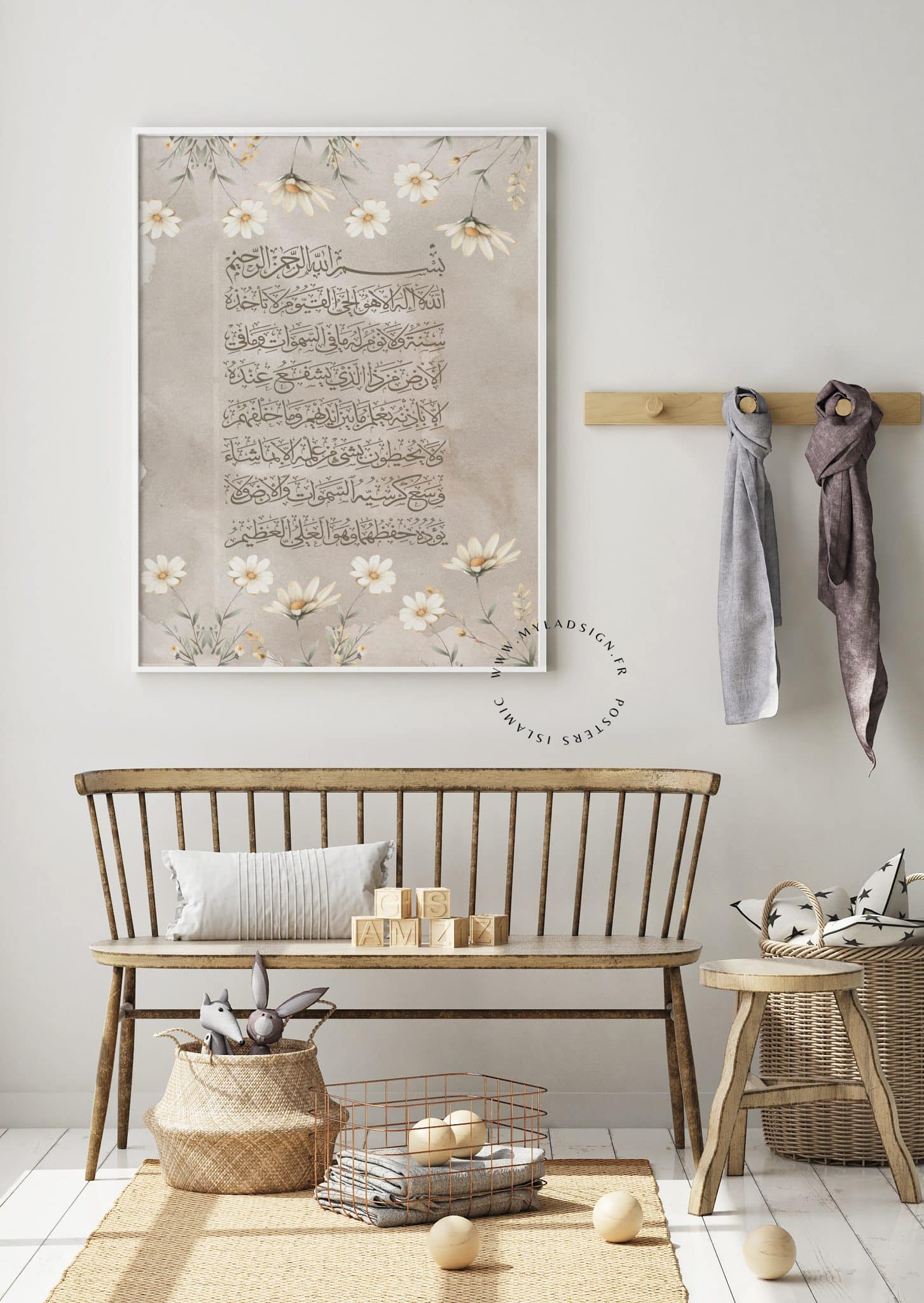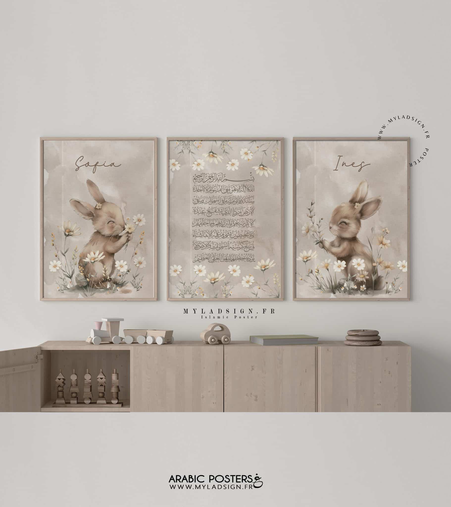 Trio d’Affiches sur un fond aquarelle beige, de magnifiques illustrations de lapins féériques ornés de jolies aquarelles florales. Les yeux apparaissent fermés pour des raisons éthiques. et au centre du trio vous avez le choix entre l’affiche Ayat Al kursi en phonétique ou en arabe. Cet ensemble de poster apportera la touche de douceur sans oublier le coté spirituel.